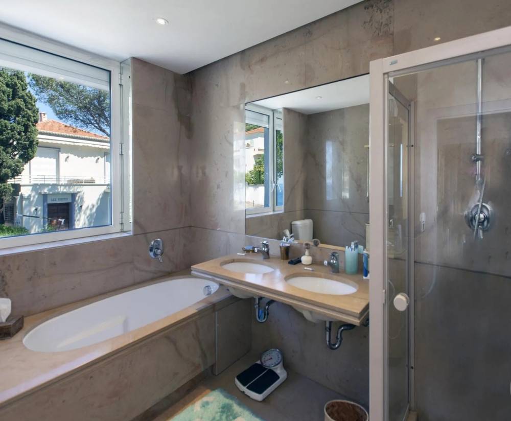The exterior is beautifully enhanced by an infinity pool, 2 garages, and 1 parking space. Enjoy a south-west exposure facing the Mediterranean, with numerous floor-to-ceiling windows, and close proximity to all amenities.