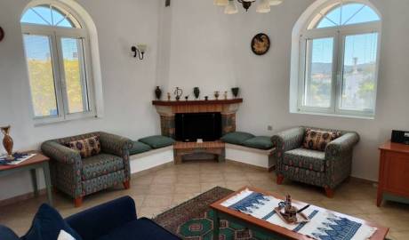 This villa for sale in Chania, Crete, is located in the village of Varipetro. It has a total living space of 132m², sitting on a 388 m² private plot. It is developed over 2 levels and consists of 2 bedrooms and 2 bathrooms. The ground floor comprises an open-plan kitchen and a dining room. There is also a lounge with a traditional brick and stone fireplace and one bathroom. This level has direct access to the landscaped garden outside. Upstairs, there are 2 bedrooms with wardrobes, one bathroom and one large balcony, offering amazing views of the sunset, the mountains and the countryside.