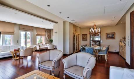 Die Villa besteht aus einer Eingangshalle, einem Wohnzimmer mit Doppelbett, einem Esszimmer, einer ausgestatteten Küche, einem Hauptschlafzimmer mit Bad, Schränken und einer Terrasse. Fünf weitere Schlafzimmer mit Bädern und Toiletten, ein Büro, ein Fitnessstudio, ein Spielzimmer, eine Werkstatt, eine Garage und Keller.